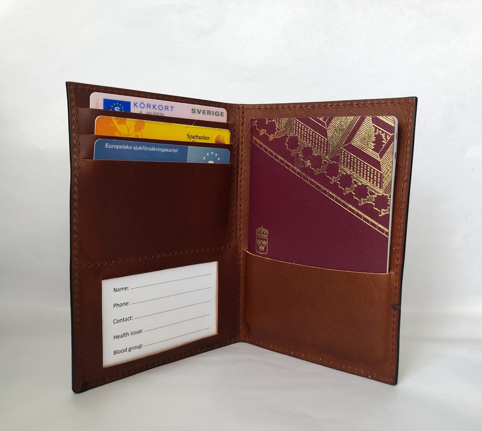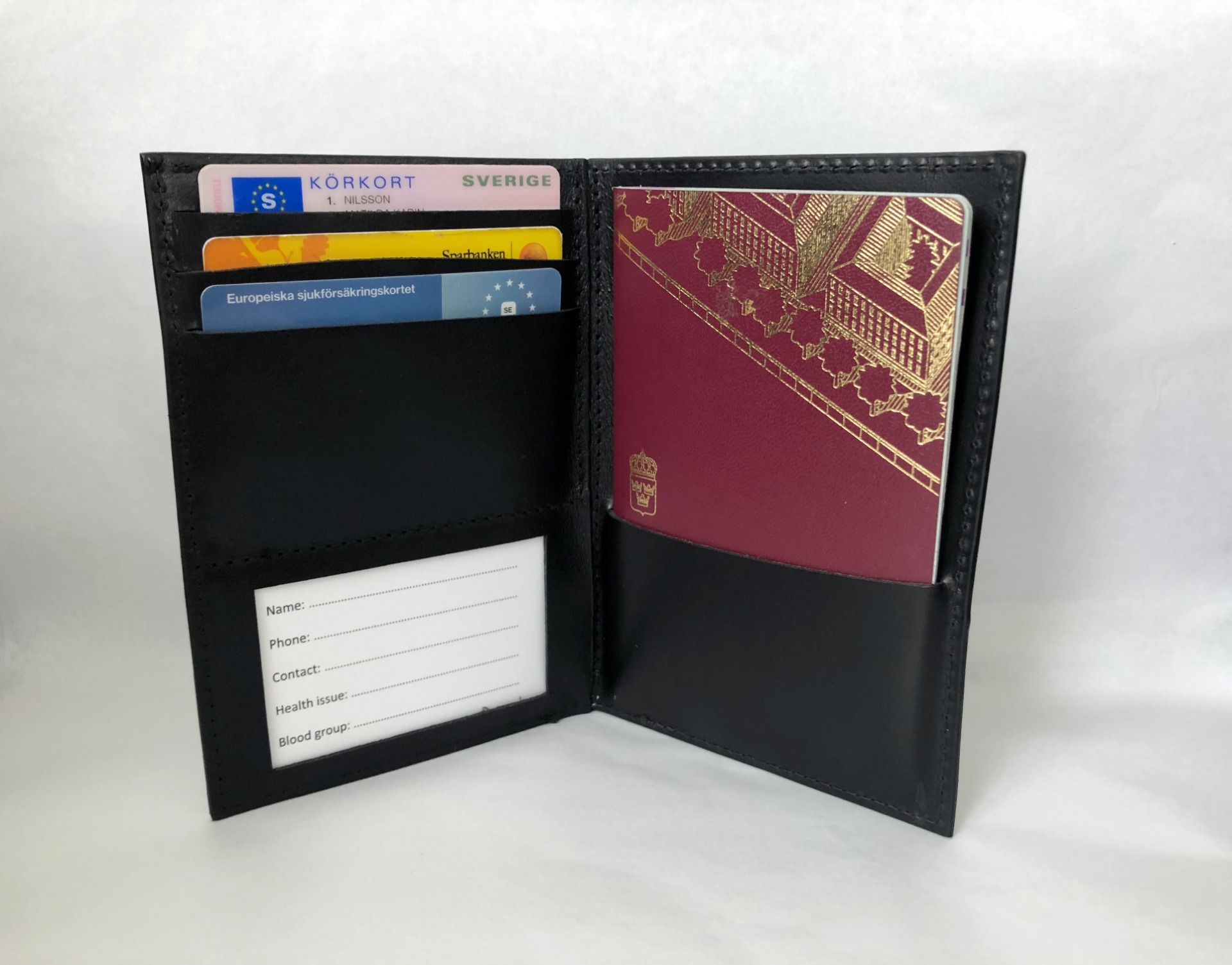 Till vårt passfodral medföljer ett ICE-kort som innehåller personlig information så som namn, telefonnummer, kontaktperson, hälsotillstånd och blodgrupp. Så skulle det hända dig något när du är ute och reser så finns denna information om dig lättillgänglig.
